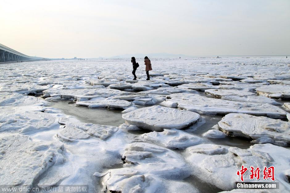 2月1日,在大连夏家河海水浴场,游客和市民在海冰上游玩。当日,由于连日来的低温,大连北部地区的海面上出现大片的海冰,呈现出极地冰原的美景。和去年相比,今年的海冰迟来了一个月。 王华 摄 图片来源:东方IC 版权作品 请勿转载