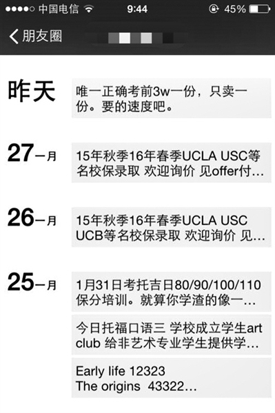 有考生在朋友圈频繁接到“托福真题”广告,一份高达3万元。