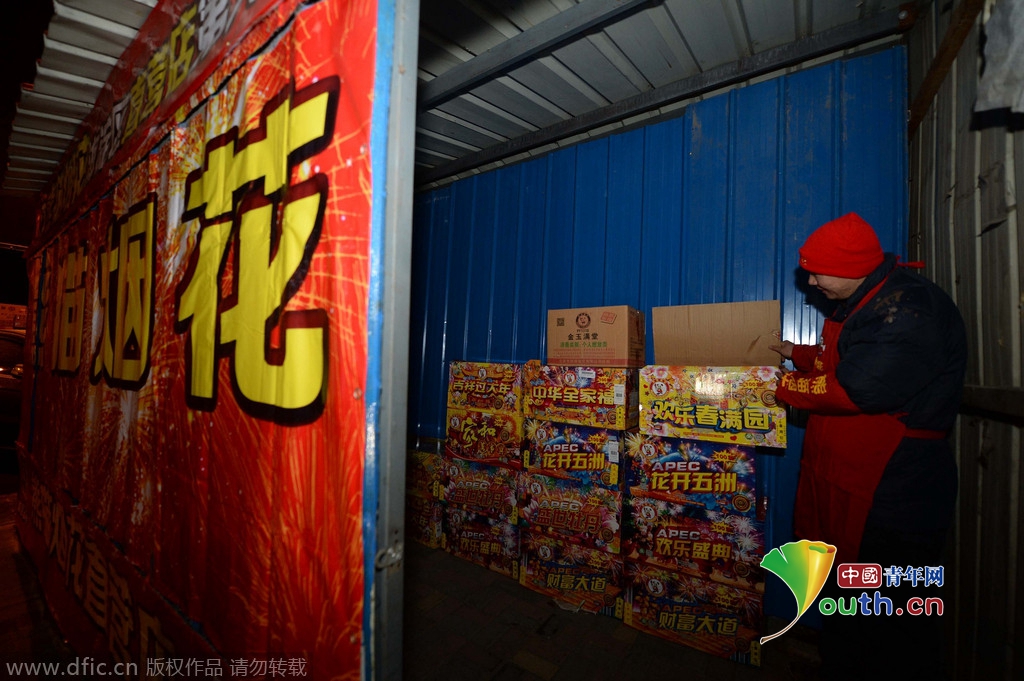 2015年2月2日晚,一辆全封闭危化品运输车停在海淀区田村的一家销售网点门前,首批外包装标有“APEC系列”“春晚系列”的烟花爆竹搬入网点内。据悉,羊年春节花炮配送工作今天正式启动,正式开卖时间为2月13日,即农历腊月二十五。