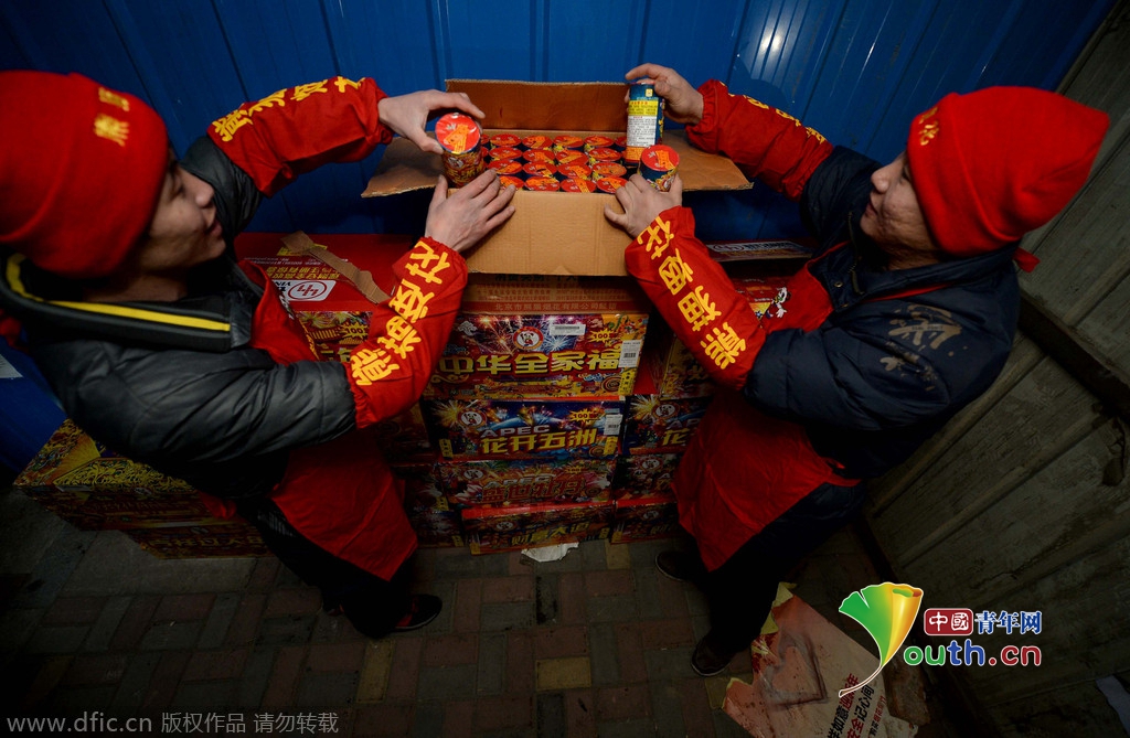 2015年2月2日晚,一辆全封闭危化品运输车停在海淀区田村的一家销售网点门前,首批外包装标有“APEC系列”“春晚系列”的烟花爆竹搬入网点内。据悉,羊年春节花炮配送工作今天正式启动,正式开卖时间为2月13日,即农历腊月二十五。