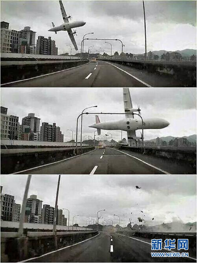 这是2月4日一辆汽车上行车记录仪拍摄到的台湾复兴航空客机从高架桥上空坠落的画面(拼版图片)。新华社发