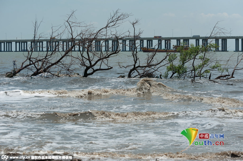 2014年6月4日,深圳, 西海堤被推倒的红树弃至已经被污染的黄色的海水里。