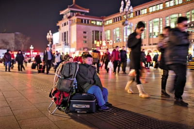 北京站广场,小男孩独自守着行李等候去取票的家人。昨日,2015春运大幕开启,32万人乘火车离京。A12-A13版摄影/新京报记者 周岗峰 实习生 彭子洋