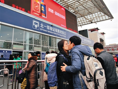昨日下午,北京西站北广场,女孩在进站离开前,与男孩吻别。