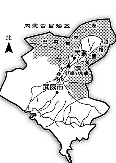 民勤县地处石羊河流域下游,其西、北、东三面被腾格里和巴丹吉林两大沙漠包围。从地图上看,民勤就像一只楔子,将两大沙漠从中间隔开。依托石羊河形成的民勤绿洲,是遏制两大沙漠合围、防止河西走廊东部地区遭受沙尘侵袭乃至沙漠化的重要生态屏障。