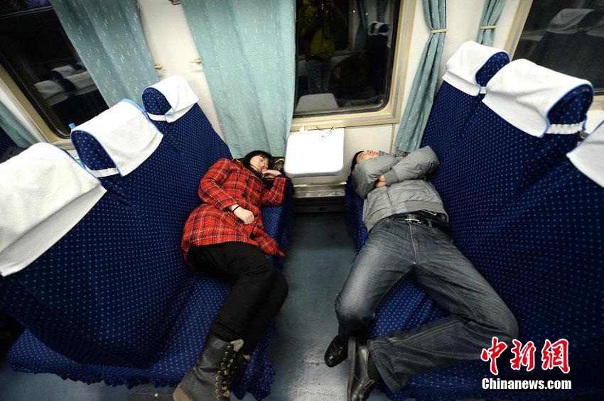 2015年2月5日,山东省济南火车站开出的K411列车上,众多乘客在硬座车厢躺卧休息。青荣高铁2014年12月28日运营后,开通了荣成经威海、烟台到北京的多趟高铁列车,这给同线路运行的k系列空调车带来冲击。秋芊 摄 图片来源:CFP视觉中国