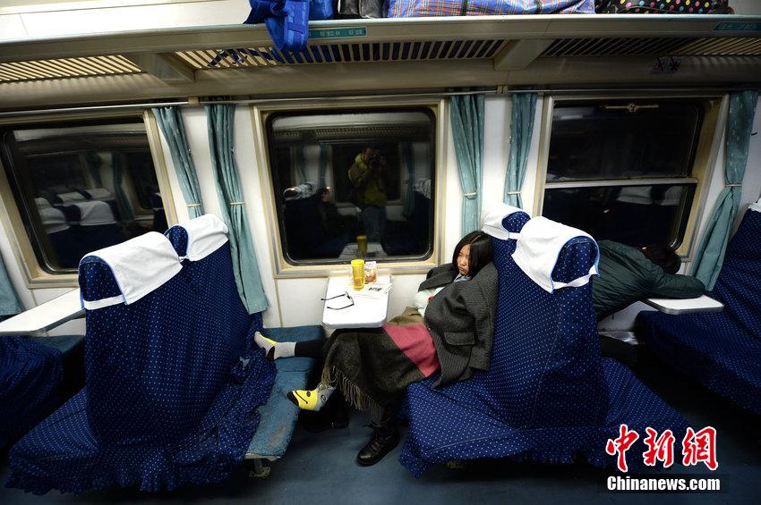 2015年2月5日,山东省济南火车站开出的K411列车上,众多乘客在硬座车厢躺卧休息。青荣高铁2014年12月28日运营后,开通了荣成经威海、烟台到北京的多趟高铁列车,这给同线路运行的k系列空调车带来冲击。秋芊 摄 图片来源:CFP视觉中国