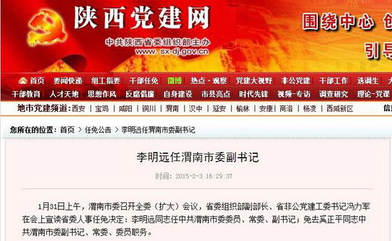 陕西省委组织部官方网站截图