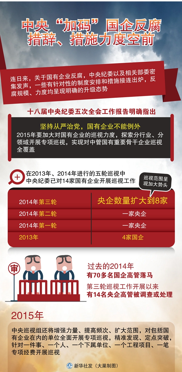 对于国企腐败问题,中央的态度十分明确;坚持从严治党,国有企业不能例外。2015年,巡视这柄反腐利剑已指向国企。中央决定,加大对国企巡视力度,实现对中管国有重要骨干企业巡视全覆盖。通过巡视等有效措施,一定要清除这些“国企蛀虫”,依据党纪国法严肃处理,公之于世,给人民群众一个交代。同时,要通过改革堵塞制度漏洞,加强监管,从体制机制上减少“蛀虫”,从根本上维护国有资产不受损失。