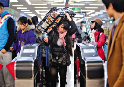 2月4日,北京西站北广场,几名乘客走出地铁闸口。昨日,北京各火车站发送旅客已突破40万人。 新京报实习生 彭子洋 摄