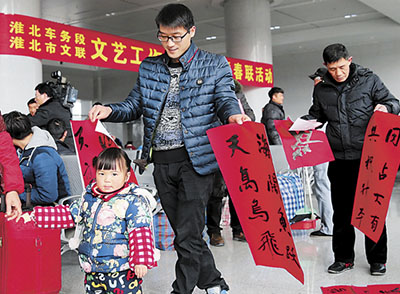 淮北车务段组织书法家们春运送春联,祝福伴归程。