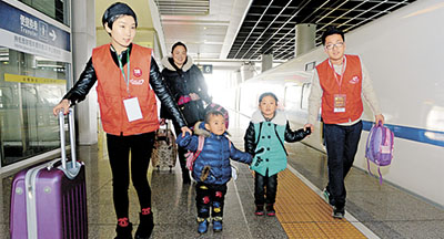 杭州春运志愿者帮助旅客提拿行李并将他们送上火车。