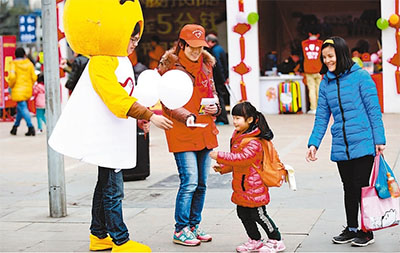 成都铁路局千名青年志愿者“小橙子”暖心上岗,吉祥物“小橙子”与小旅客互动。