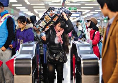 2月4日,北京西站北广场,几名乘客走出地铁闸口。新京报实习生 彭子洋 摄