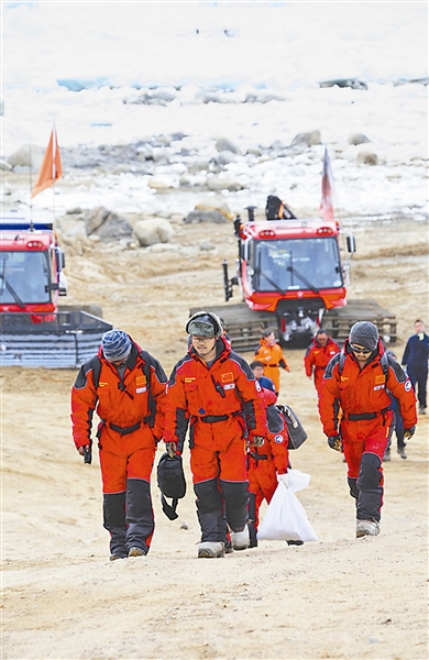 上图:当地时间2月7日上午,自2014年12月中旬奔赴南极内陆昆仑站工作的中国第31次南极科考内陆队圆满结束任务凯旋,返回到中山站大本营。图为当日内陆队员返回到中山站大本营。
