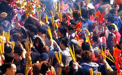 明清时期,京城讲究的是上东岳庙烧“头炉香”。东岳庙位于朝阳门外大街,始建于元代延佑六年(1319年),主祀泰山神东岳大帝,是道教正一派在华北地区最大的宫观,有“第一丛林”之称,规模宏大,气势壮观,历史极为悠久。为什么讲究上东岳庙烧头香呢?在科学尚不发达的年代,人们修建寺庙为的是求得神灵的保护,而民间认为东岳大帝是上天与人间沟通的神圣使者,治理天下的保护神,能固国安民,延年益寿,降福消灾,所以每到辞旧迎新之际便到此祭拜,烧“头炉香”,祈吉求福。