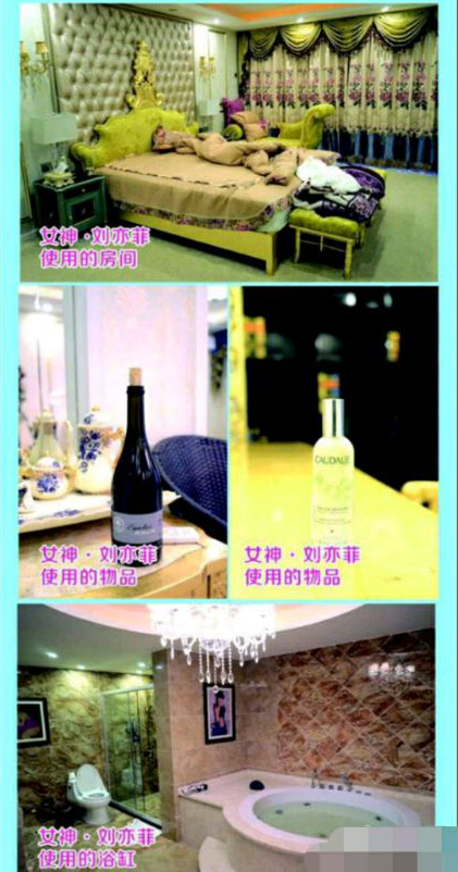 第二张微信截图,均为标为刘亦菲房间内景,多张小图展示出刘亦菲使用过的房间、物品、浴缸,其中物品类有一瓶打开过的红酒。