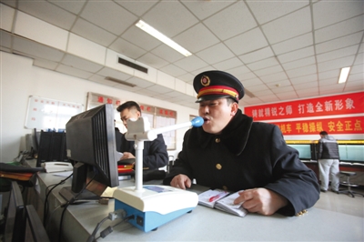 2月9日,北京南站排班室,高铁司机上岗前进行酒精测试。本版摄影/新京报记者 侯少卿