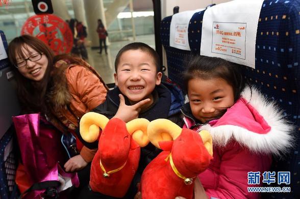 2月11日,小朋友跟随父母乘坐D5996次爱心列车。当日,由湖北省广播电视台、湖北省总工会、武汉铁路局等单位联手开行的免费农民工专列——D5996次动车组从武汉站驶出,500多名在武汉务工的农民工携带子女,乘坐免费动车专列回恩施、利川、宜昌等地,当天便能与亲人团聚过小年。 新华社记者 肖艺九 摄
