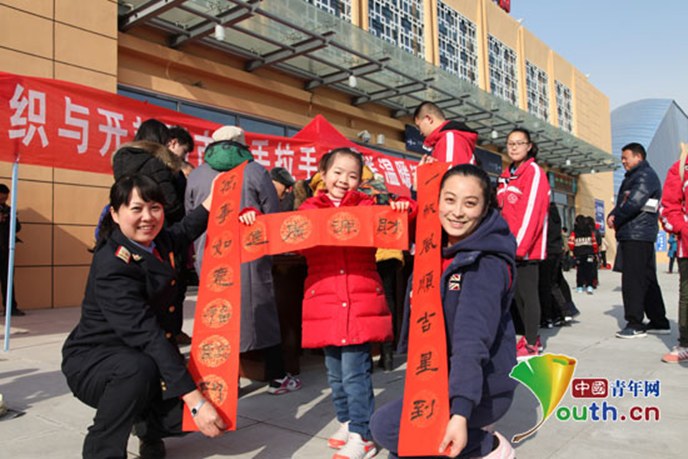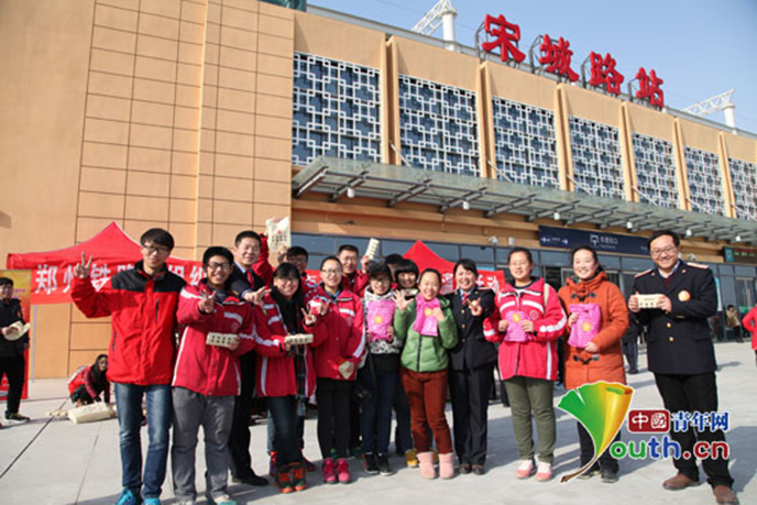 这一天,郑州铁路局郑州东车站、开封车站等6个铁路单位的团组织牵手共青团开封市委,在郑开城际宋城路站开展“手拉手小年送温暖”活动,青年志愿者为广大旅客送去节日的祝福。