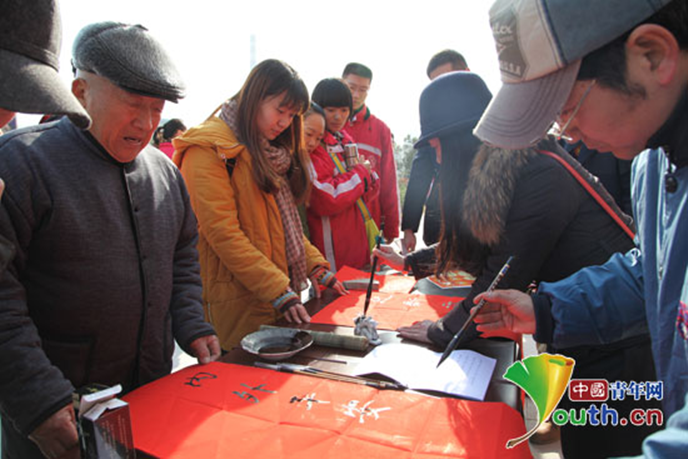 青年志愿者现场撰写春联吸引过往旅客竞相领取。 通讯员 吴秀栋、赵宏俊 摄
