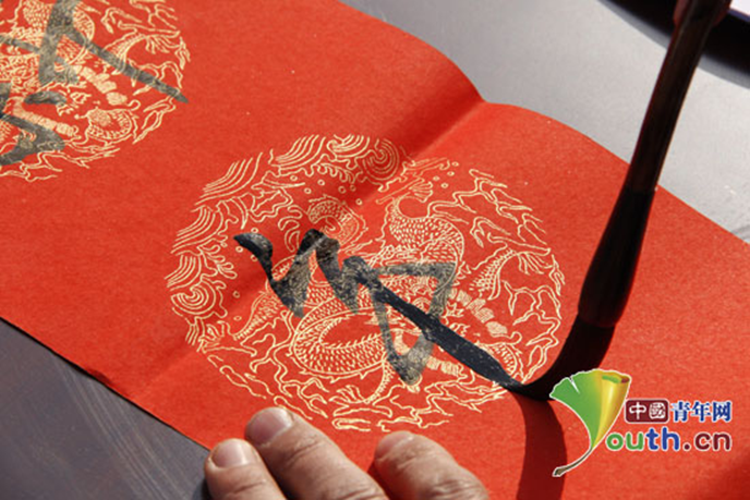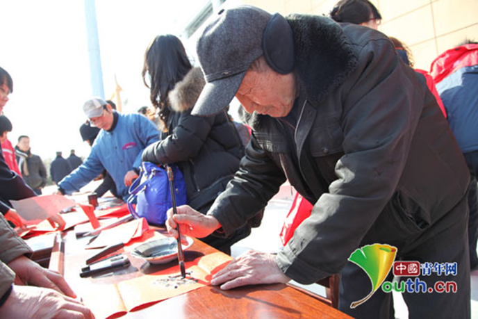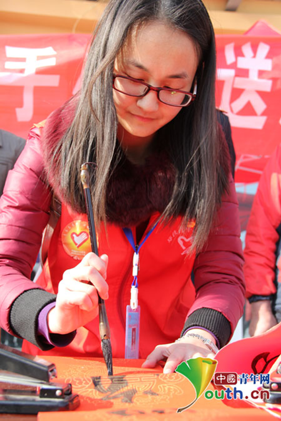 共青团开封市委邀请的市书法家协会会员,服务铁路春运的青年志愿者,现场撰写春联为广大旅客送上新年的美好的愿望。