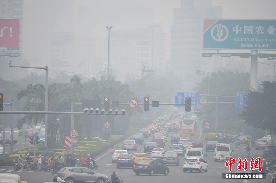 2月12日,受污染物远距离输送、本地不利气象条件及局地污染源排放的共同影响,海南省首次出现大范围空气重度污染天气。根据海南省空气质量实时发布系统监测,12日该省北部及西北部市县可吸入颗粒物(PM10 )和细颗粒物(PM2.5)浓度较11日大幅上升。当日1时至12时,海口市出现5个小时城市空气质量指数(AQI)超过200的重度污染,12小时平均达到中度污染水平;澄迈县、临高县、昌江县也分别出现1—3个小时的重度污染;最严重的东方市则出现5个小时重度污染,12小时平均水平接近重度污染。图为海口市龙昆南路笼罩在一片“灰蒙蒙”中。中新社发 骆云飞 摄