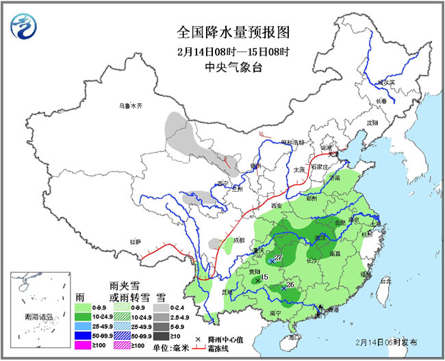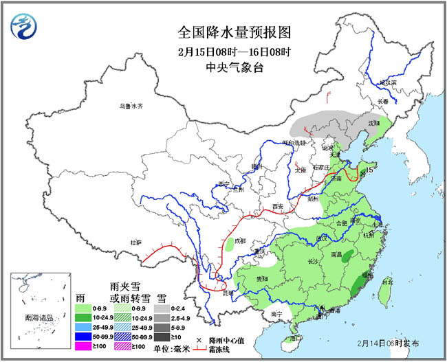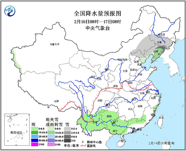 2月14日至16日,黄淮及其以南大部地区有小到中雨,局地大雨,云南南部、贵州及湖南西北部等地的部分地区伴有雷暴。15日至16日,吉林、辽宁、内蒙古东南部、河北北部等地有小到中雪(雨)或雨夹雪,其中,辽宁东北部、吉林东南部的部分地区有大雪(5~9毫米)。