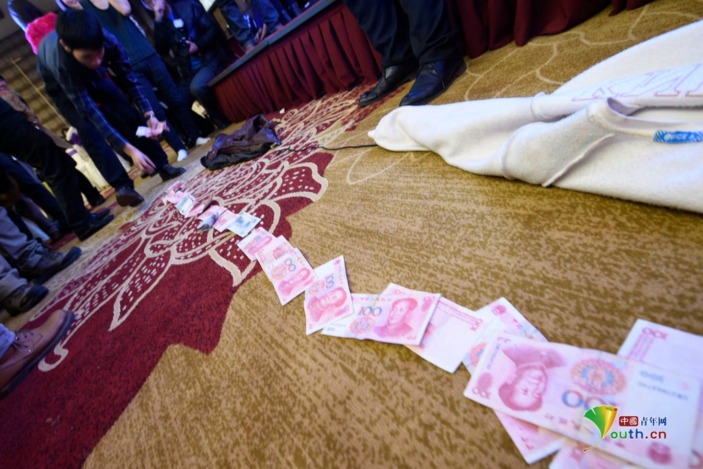 2015年02月14日,山西省太原市,情人节千人相亲大会游戏互动环节一名男嘉宾现场撒万元人民币架设“鹊桥”成功牵手女嘉宾。