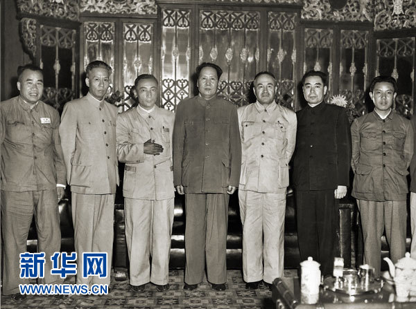 1950年6月,毛泽东、朱德、刘少奇、周恩来同志在全国政协一届二次会议期间与包尔汉、赛福鼎、邓力群(右一)等同志合影。新华社发