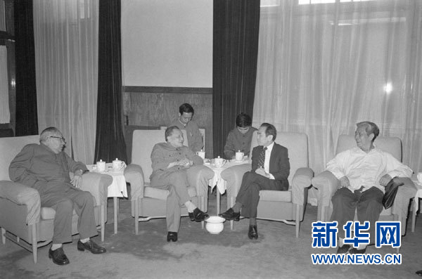 1982年6月2日,邓小平同志在北京人民大会堂会见香港大学校长黄丽松,邓力群同志(右一)参加会见。新华社记者 唐理奎 摄