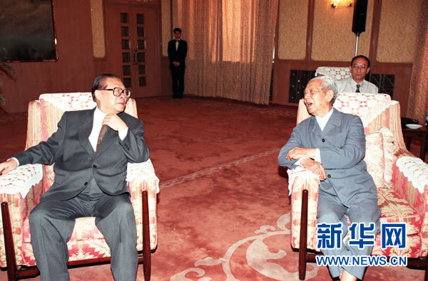 1999年6月30日,江泽民同志同邓力群同志交谈。新华社记者 王新庆 摄