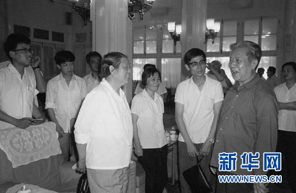 1983年5月31日,邓力群同志(前右一)在北京中南海同上海职工读书报告团的同志交谈。新华社记者 赵天聘 摄