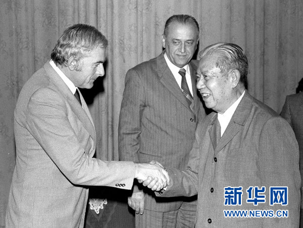 1985年9月27日,邓力群同志在北京人民大会堂会见由罗马尼亚通讯社秘书长扬·巴德亚率领的罗马尼亚新闻代表团。新华社记者 齐铁砚 摄
