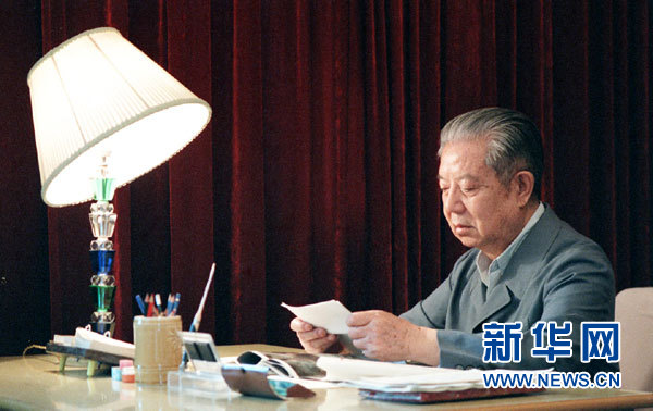 1987年7月,邓力群同志在办公室内工作。新华社发(刘宇 摄)