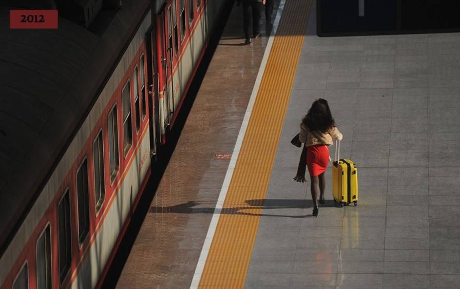 2012年1月5日,列车即将开行前,一个女孩在赶车。