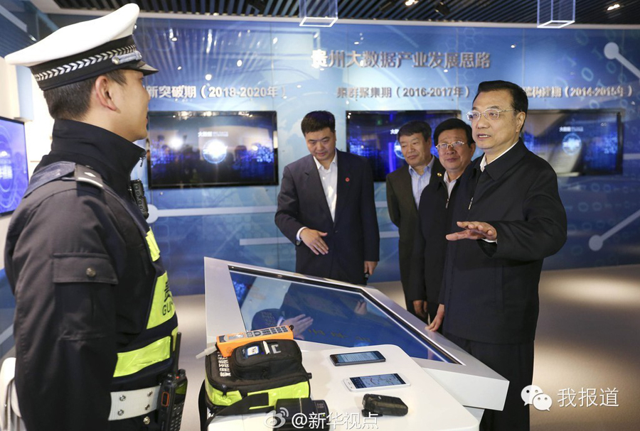 14日,李克强在贵州考察北京·贵阳大数据应用展示中心,详细了解贵阳利用执法记录仪和大数据云平台监督执法权力情况。他说,把执法权力关进“数据铁笼”,让失信市场行为无处遁形,权力运行处处留痕,为政府决策提供第一手科学依据,实现“人在干、云在算”。