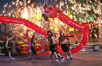 温度高达1500℃的铁水加入特质钢花,被拍打至高空。昨日,欢乐谷,国家级非物质文化遗产“火龙钢花”团队为游客表演。“铁水流星”的壮丽景致,再配以原生态的火龙,游客可近距离欣赏到演员在火花中穿行的高难度表演。据介绍,羊年大年初一至初六,游客们都可以欣赏到“火龙钢花”演出。新京报记者 薛珺 摄影报道