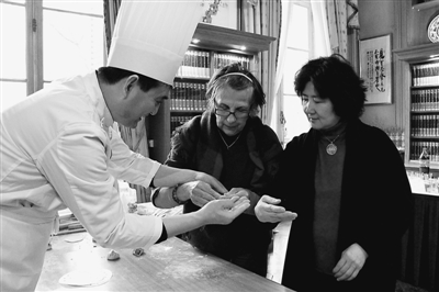 法国巴黎中国文化中心举行“相聚巴黎迎新春,走进文化中心过大年”活动。图为法国观众学包天津包子。