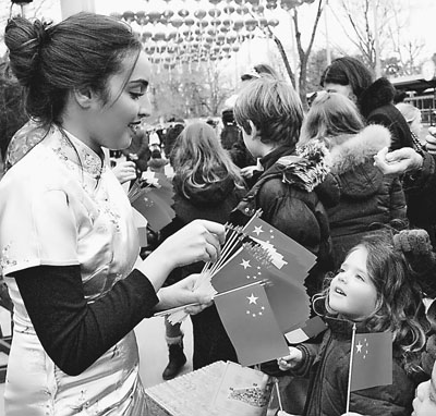 巴黎中国狂欢节上的小朋友争相获得一面中国国旗。