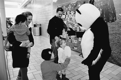 2月15日,华盛顿泰森角购物中心首次举办中国农历羊年庆祝活动。图为孩子们都想和“大熊猫”握握手。