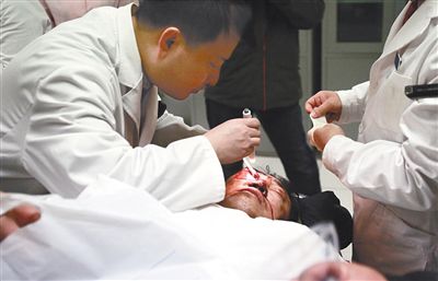 除夕夜,同仁医院急诊室,一平谷男子被礼花弹炸伤,医生为他紧急处理。