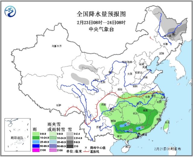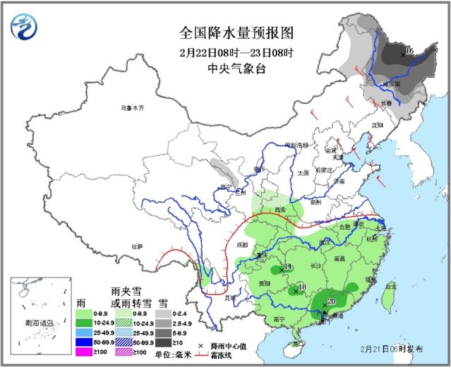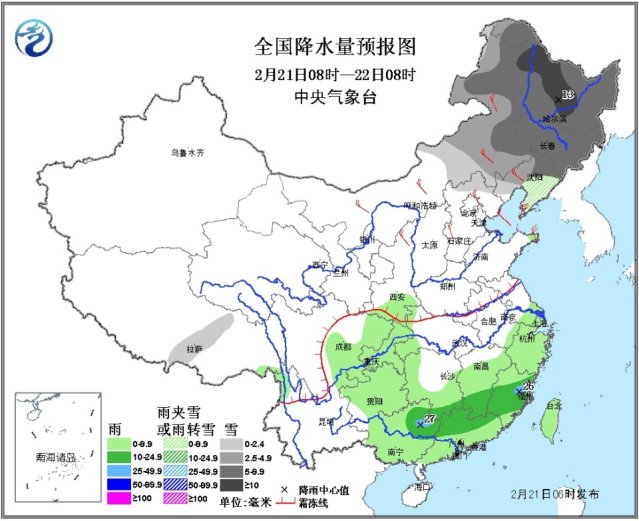 21日08时至22日08时,内蒙古中东部、东北地区、华北北部等地有小到中雪或雨夹雪,其中,内蒙古东部、东北地区中北部的部分地区有大雪,局地暴雪(10~13毫米);西南地区东部、江南中南部、华南大部等地有小到中雨,局地大雨。内蒙古中东部、东北地区南部、华北、黄淮北部等地有4~6级偏北风。渤海、东海将有7~8级风,阵风9级。