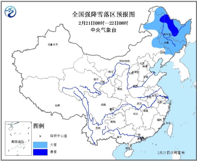 21日至22日,内蒙古东部、东北地区大部等地将有较强降雪。其中,21日08时至22日08时,内蒙古东部、东北地区中北部等地的部分地区有大雪,其中,黑龙江中西部局地有暴雪(10~13毫米);上述地区最大积雪深度有3~11厘米,部分地区将出现道路结冰。中央气象台2月21日06时发布暴雪黄色预警。