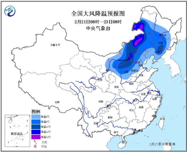 受较强冷空气影响,21日08时至23日08时,内蒙古中东部、华北大部、东北大部等地气温将下降6~10℃,其中,内蒙古东部、华北西北部等地的局部地区降温幅度可达12~14℃;内蒙古中东部、华北中北部、东北地区中南部有5~6级偏北风;渤海、东海将有7~8级、阵风9级的西北风。中央气象台2月21日06时发布大风降温预报。