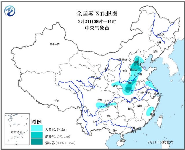 21日早晨到上午,华北中南部、黄淮西部、江汉北部、陕西关中、四川盆地南部、江苏中部、福建北部等地有能见度不足1公里的大雾,其中,北京、天津、河北中部、河南中部等地的部分地区有不足500米的浓雾,局地有不足200米的强浓雾。中央气象台2月21日06时继续发布大雾黄色预警。