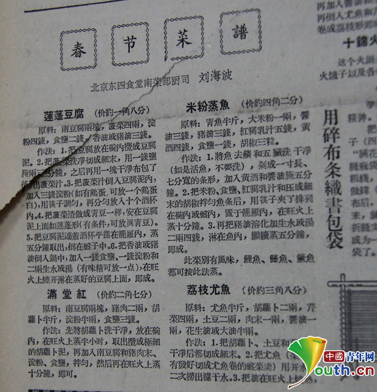 1957年春节期间,报纸上刊登的北京东四食堂的菜谱。中国青年网记者 王龙龙摄