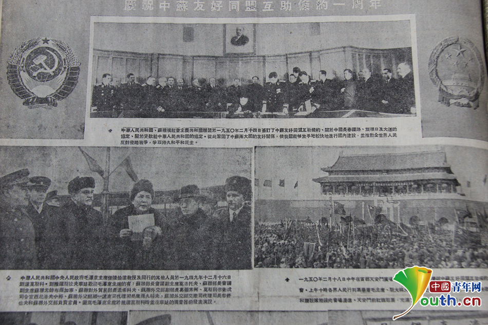 1951年春节期间刊登的《庆祝中苏友好同盟互助条约一周年》组图报道。中国青年网通讯员 王燕新摄