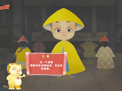 相比之下,“皇帝的一天”更受欢迎。它虚拟了一个故事:少年皇帝想要出宫,乾清门外的小狮子于是帮忙为皇帝找替身。从清晨5点起床穿衣开始,读书、骑射、上朝、用膳,玩家就这样当起了“皇帝”。游戏中,小狮子还客串“讲解员”,通过弹出文字介绍清代宫廷礼节以及服装、文化等知识。