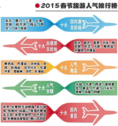 旅游已是百姓日常生活的重要组成部分,今年春节旅游消费依然强劲。中国旅游研究院近日联合携程旅行网,结合超过2.5亿用户群体数据,对今年春节假期的旅游情况和游客行为进行了全面监测,发布了2015春节旅游人气排行榜和相关分析报告。